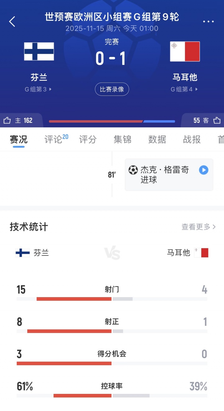 11月15日訊 FIFA排名第166的冷門馬耳他,今日在世預賽歐洲區預選賽中客場1-0戰勝FIFA排名第72位的第馬芬蘭。